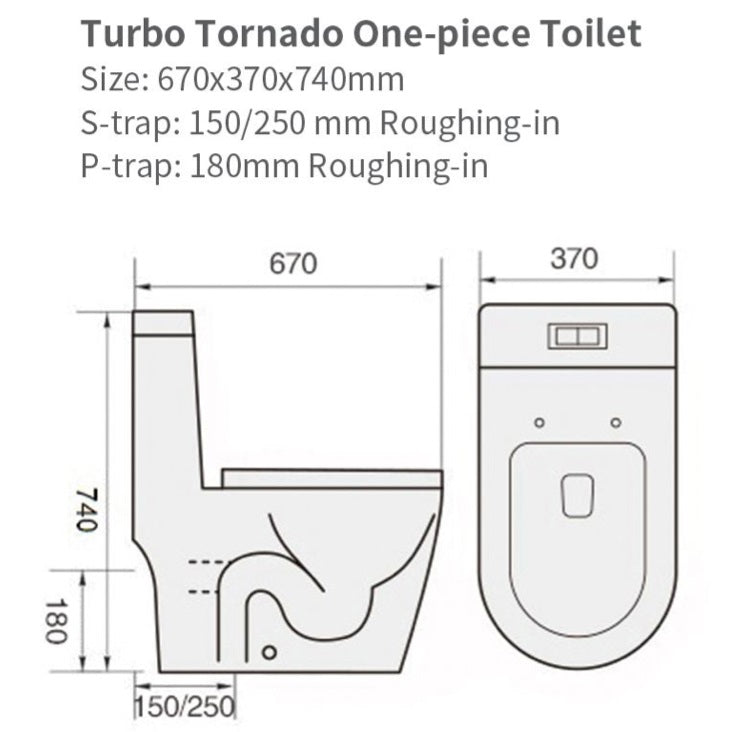 Code : WC-935 Material : Vitreous China Dimension : 670 x 370 x 740mm Flushing System : Turbo Tornado Water Efficiency : √√√ S Trap(mm) : 150/250mm Roughing in P Trap(mm) : 180mm Roughing in