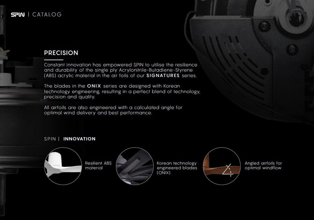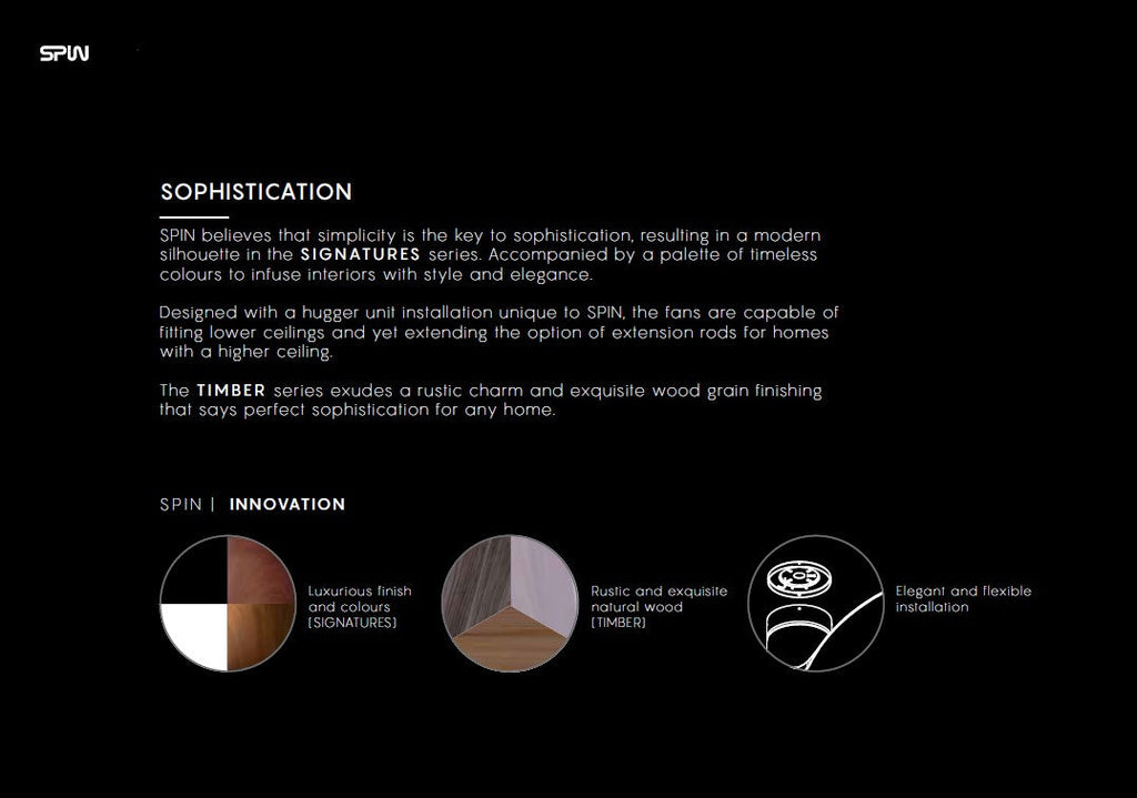 Introducing the SIGNATURES series - SPIN’s humble beginning into the ceiling fan industry. Years of designing, developing and engineering has resulted in an improved range of ceiling fans that started this journey. The brand has expanded this range from only one size in three simple colour options, to an impressive three sizes with a palette of four colours.